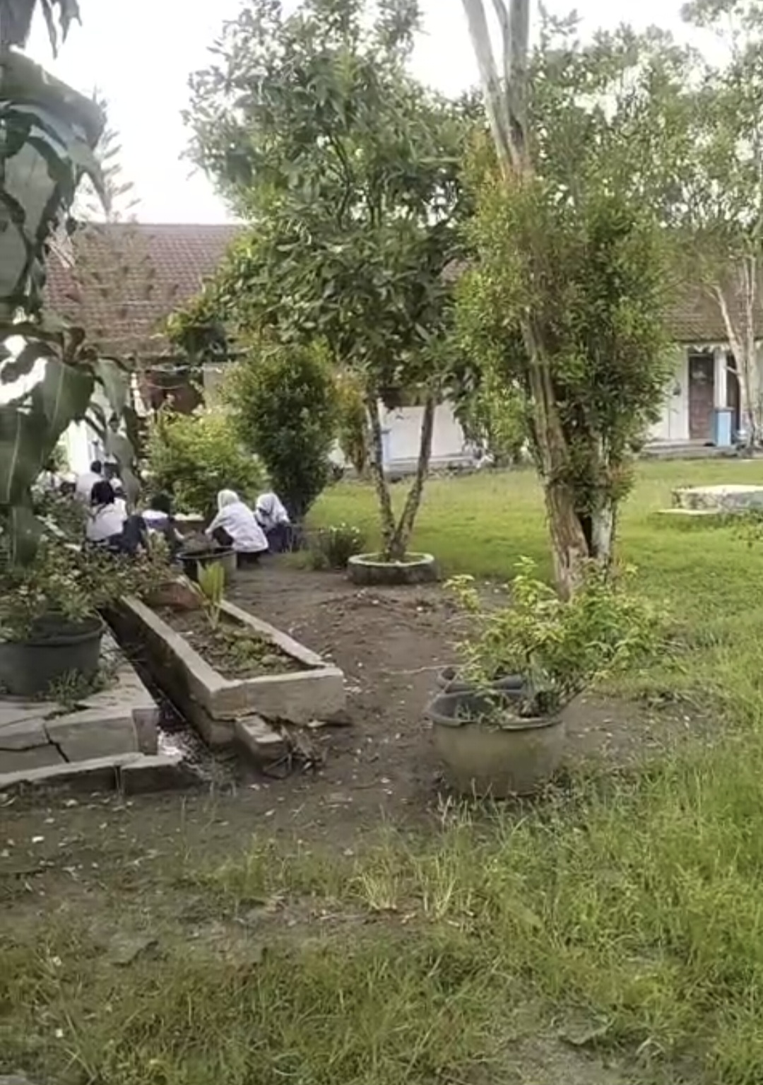 Kegiatan Gotong Royong bersama guru dan murid membersihkan lingkungan sekolah